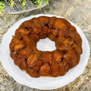 - In a pot over medium heat, add in butter, brown sugar and 1/3 cup of the leftover cinnamon sugar mix. Once all melted together, pour into bundt pan.