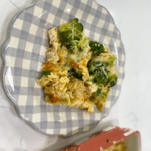 - To a medium sized bowl add in the cooked chicken, rice, water, onion, broccoli, and 1/3 cup of the parmesan stir well.