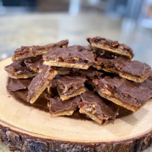 - Once out of the oven immediately unwrap the Hershey’s bars and place them in a single layer over the toffee layer. You may need to break a few of the bars into sections.