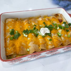 - Preheat the oven to 350℉. Remove the plastic wrap, then cover the baking dish with aluminum foil and bake for 38 minutes. Remove the aluminum foil and sprinkle the remaining 3/4 cup of cheese on top. Bake for an additional 15-20 minutes, uncovered, until the cheese is melted and bubbly. Serve with your favorite toppings like sour cream, chopped tomatoes, cilantro, and green onions. Enjoy!