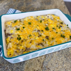 I was excited to try a new breakfast casserole, but am glad I made only a half recipe (in an 8×8 pan). We’ve had grits before as a side dish, with cheese stirred in, and liked them. However the grainy texture of them in this casserole was distracting. Perhaps mine needed to cook a couple of minutes more before stirring in the butter and other ingredients, or the leftovers may absorb more moisture/soften as they refrigerate overnight. I did top the casserole with the optional cheese. We’ll try adding salsa as a topping tomorrow when I reheat some squares for breakfast.