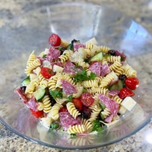 - Add the pasta to a large bowl along with the rest of the ingredients. Stir well and refrigerate for an hour. Enjoy!