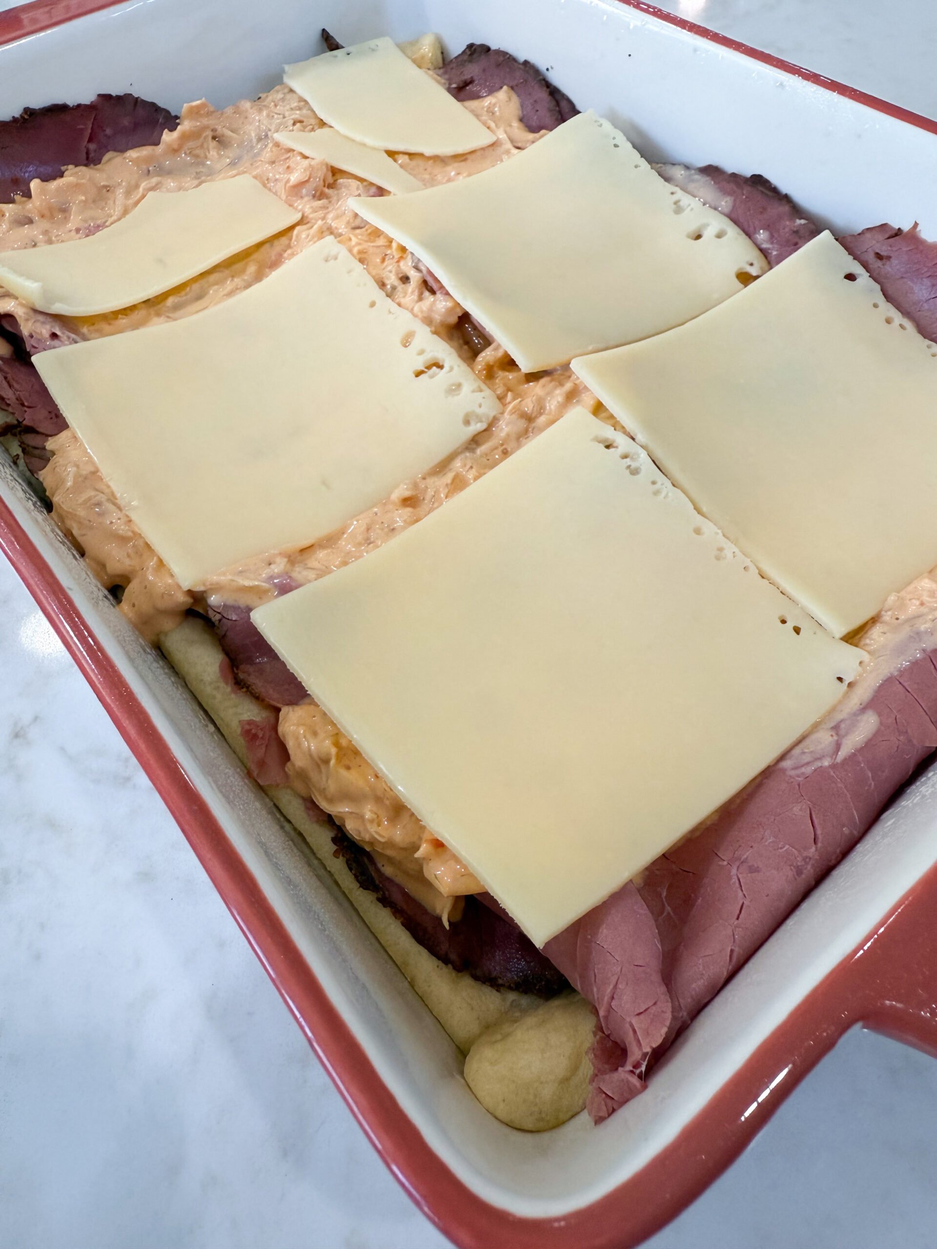 🛒 Key Ingredients: Crescent roll dough, pastrami, Swiss cheese, Thousand Island dressing