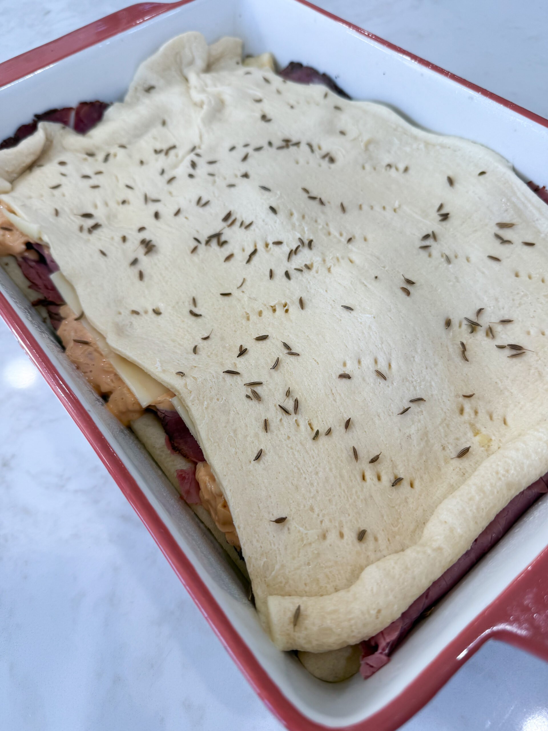 - Top with second crescent sheet, press edges, sprinkle caraway.