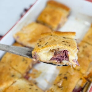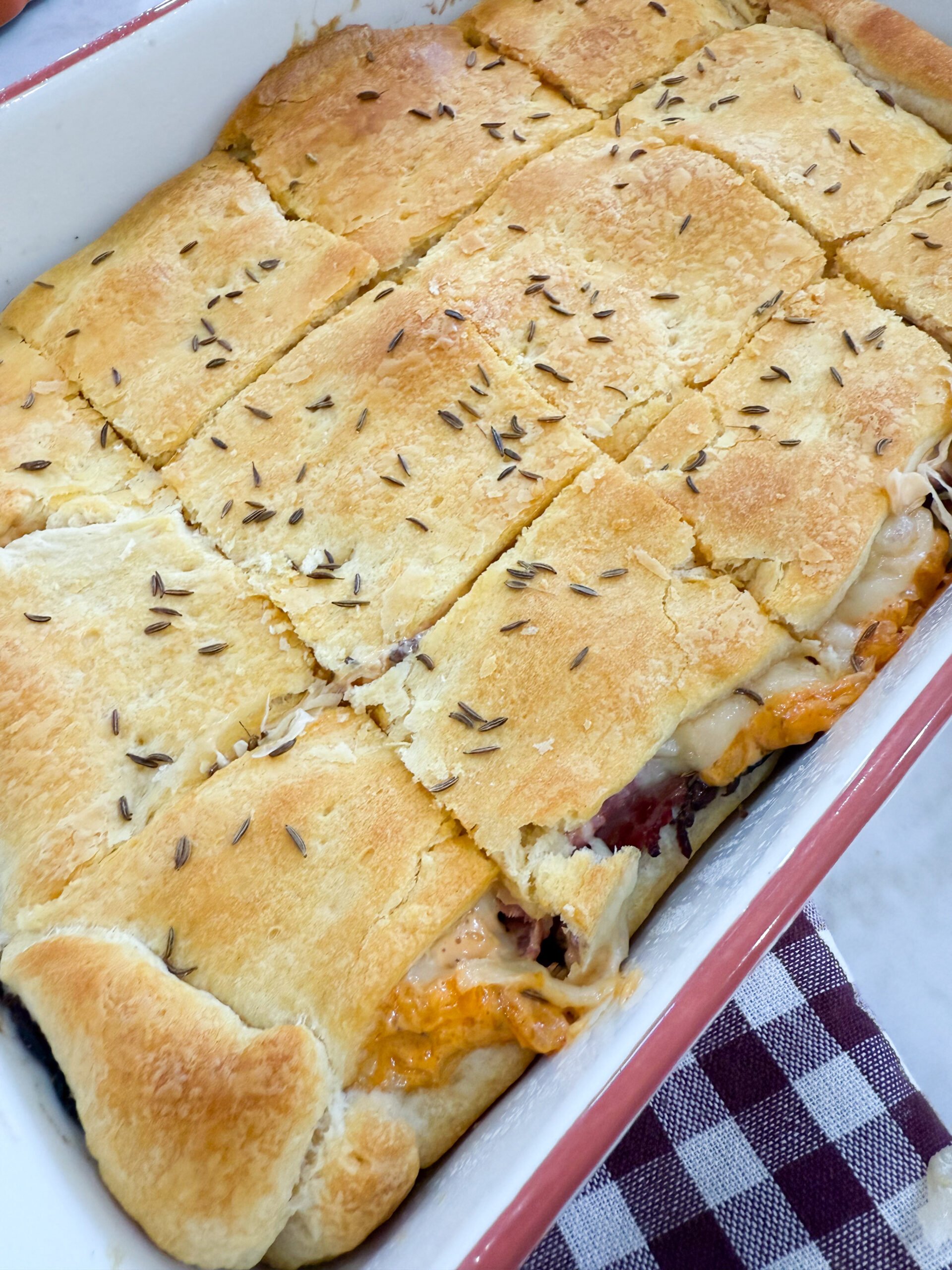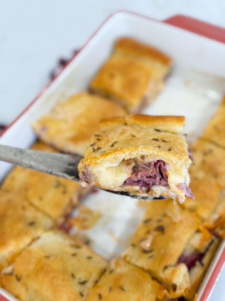 I grew up loving deli sandwiches, and this recipe is my easy way to bring those flavors into a hot, bubbly bake. The layers of salty pastrami, tangy sauerkraut, and creamy dressing all melt together with Swiss cheese under a buttery crescent crust — it’s seriously one of my favorite comfort foods.