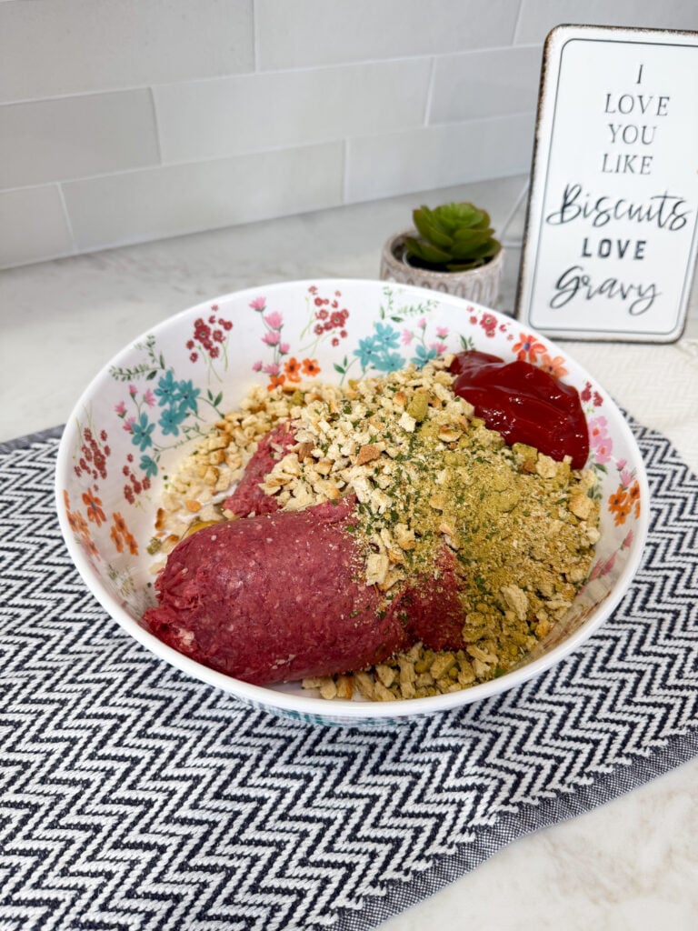 Step 2: In a large bowl, combine ground beef, stuffing mix, eggs, milk, and ¼ cup ketchup.