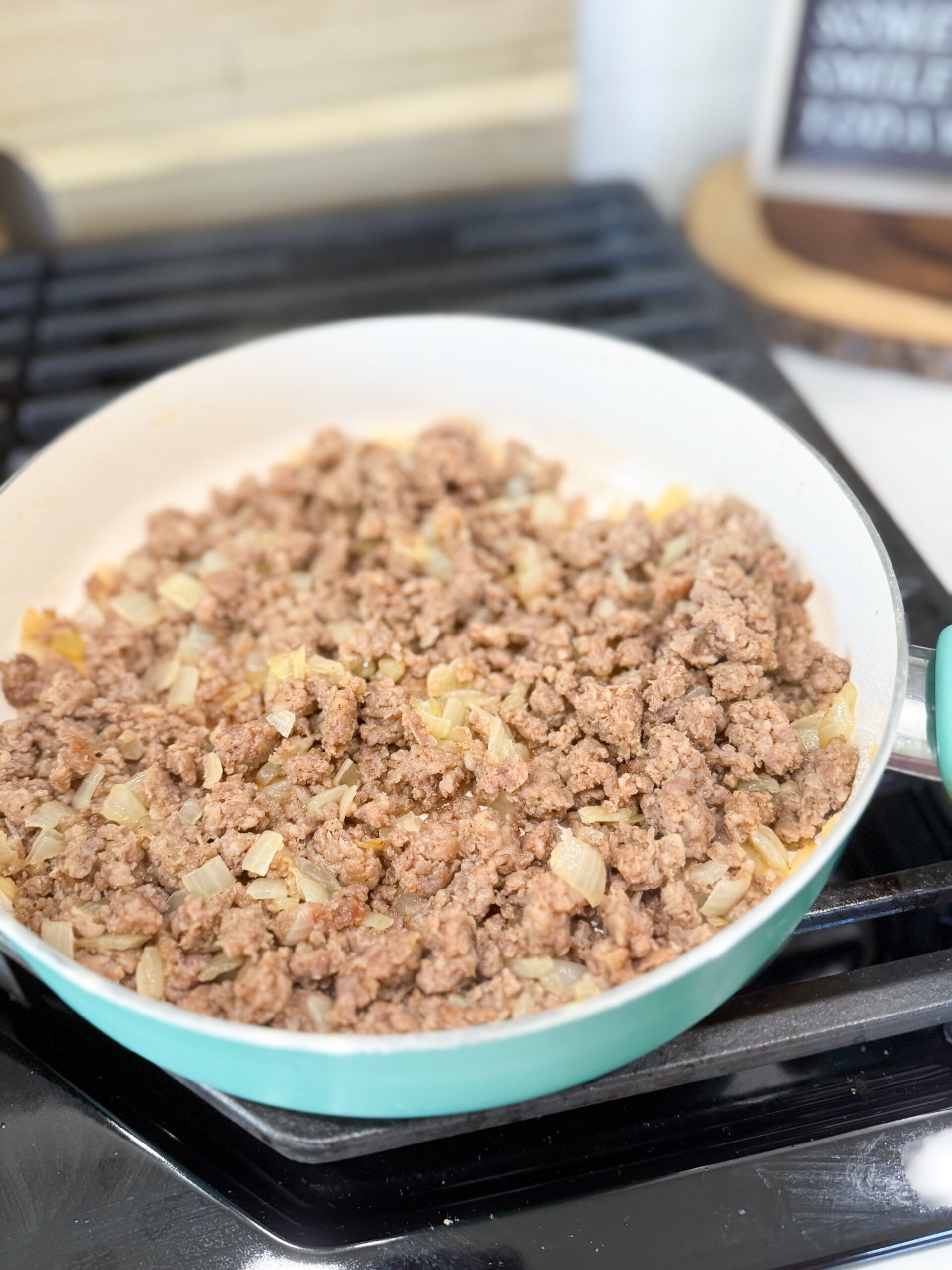 Step 1: In a skillet over medium heat, cook sausage and onion until browned. Drain excess grease.