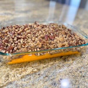 - For the pecan topping, mix all the ingredients until the pecans are well coated and sprinkle over the sweet potato mix.