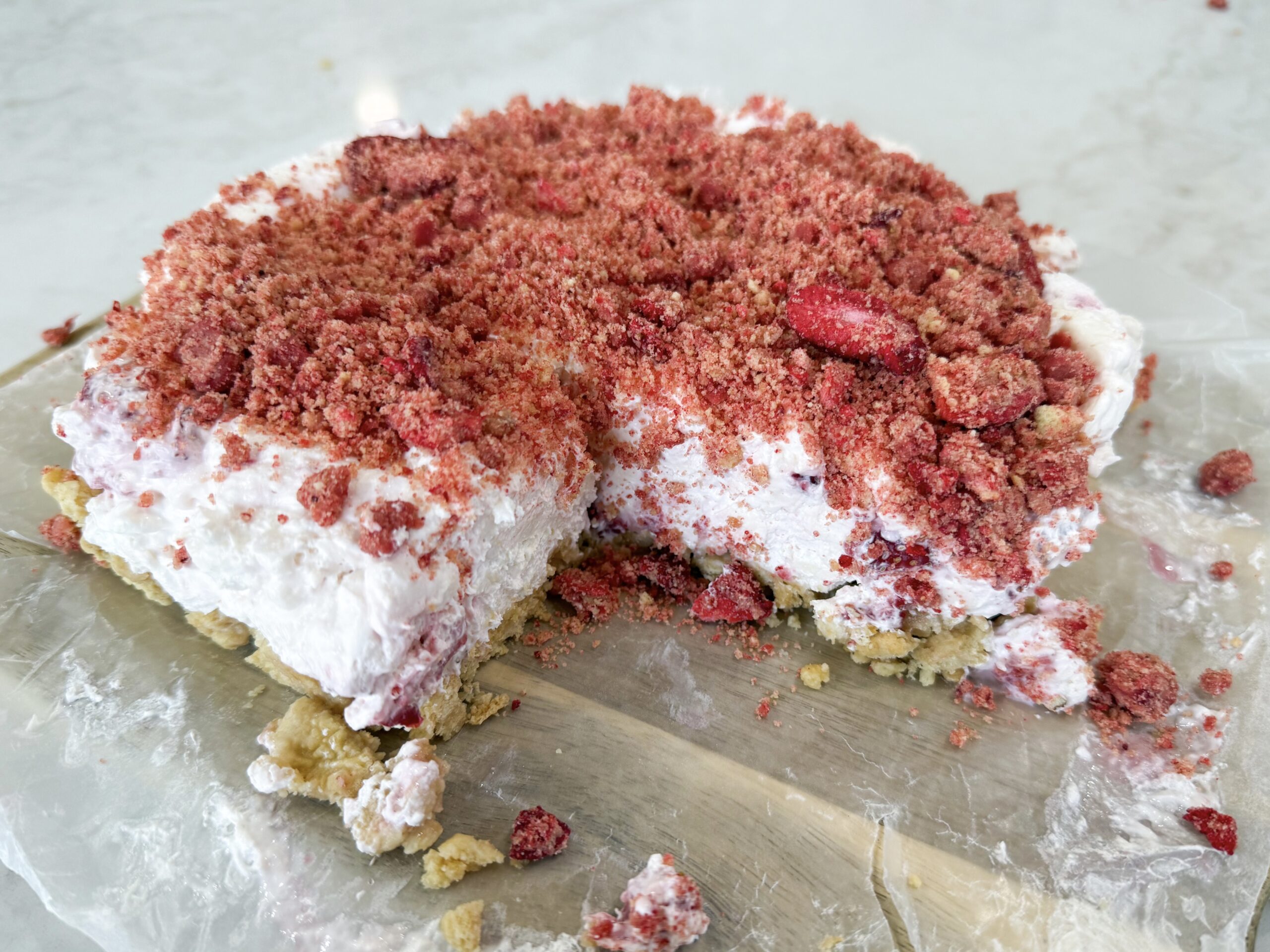 - Freeze-dried strawberries give the crumble its bright color and crunch.