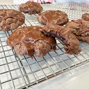 - Make the icing. To a small saucepan add the butter, milk, and cocoa powder in turn the heat to low and whisk frequently until the butter has melted and the ingredients are combined. Remove from the heat and stir in the powdered sugar one cup at a time. Drizzle this icing over the top of all of the cookies, let cool then enjoy.