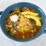 Once cooked stir well. Top with your favorite toppings, cheese, sour cream, tomatoes, cilantro, and more!