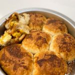 Using a rolling pin roll each biscuit out thin. Fill each biscuit with a little bit of the cheese, scrambled egg, and bacon. Bring the edges together and pinch to seal the seams. Place seam side down in a round greased 9 inch cake pan.