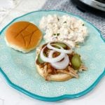Once cooked shred the meat in the slow cooker keep the juices in the slow cooker. You can sherd the meat with an electric hand mixer, meat masher or two forks. Once shredded serve in hamburger buns and if you like yours saucy you can add extra barbecue sauce in your sandwich enjoy!