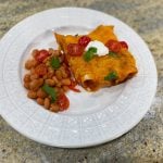 Scoop a spoon full of the ground beef mixture into each corn tortilla, roll it up and place seam size down into the baking dish. Once all of the enchiladas are made pour the remainder of the enchilada sauce on top then sprinkle with the remainder of the cheese.
