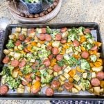 Once the potatoes are out of the oven add the chicken sausage and vegetable on the pan. Bake for 25 minutes. Enjoy.