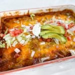 Into the baking dish add the meatballs, corn, green chilis, enchilada sauce, black beans, and 1/3 cup of the cheese. Stir well to coat everything in the enchilada sauce. Cover tightly with foil and bake for 30 minutes.
