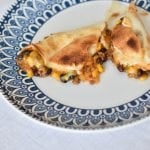 Place a tortilla on top in the center, and fold over the first layer of tortillas to completely cover the top of the quesadilla.
