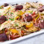 Cut the kielbasa into 4 inch lengths and place into a large mixing bowl with the bell peppers, onions, olive oil, and seasonings stir well. Now add the pierogies in the bowl and stir to coat them in the seasonings.