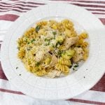 Now add back in the cooked chicken, cooked drained pasta and give it a stir. Let this cook together for 2 to 3 minutes. Stir in the Parmesan cheese once the Parmesan has melted serve and enjoy!