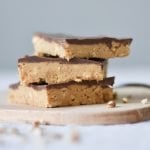To a microwave-safe bowl, add the chocolate chips and 1/4 cup of peanut butter. Place in the microwave for 30 seconds at a time, stirring after every interval, until melted and smooth. Spread over the peanut butter layer.