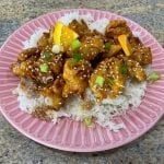 We are making the sauce now. In a deeper pan or pot on the stove add the orange juice, soy sauce, vinegar, brown sugar, and garlic bring this mixture up to a simmer while whisking, once simmering add the cornstarch slurry in and whisk until the sauce starts to get thick. Now add the cooked chicken in and coat the chicken in the sauce try to coat the chicken quickly so the chicken can be as crisp as possible.