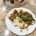 In the slow cooker, add in the chicken breast and on one side add in the potatoes and the other side for green beans. Pour the marinade over it all.