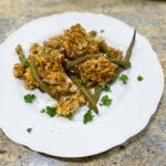 Place half of the green beans on the chicken, then scoop the stuffing mixture on the green beans spread the stuffing out as even as possible. Top with the rest of the green beans.