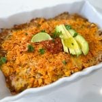 Add 1/2 cup of the crushed Doritos to the bottom of the baking dish, sprinkle half of the cheese over the Doritos, pour the taco mixture over the cheese and spread it out. Sprinkle with the remaining Doritos and cheese. Bake for 30 minutes.