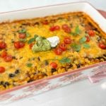 Directly into the baking dish, add the rice, black beans, salsa, vegetable broth, taco seasoning and 1/2 cup of cheese.