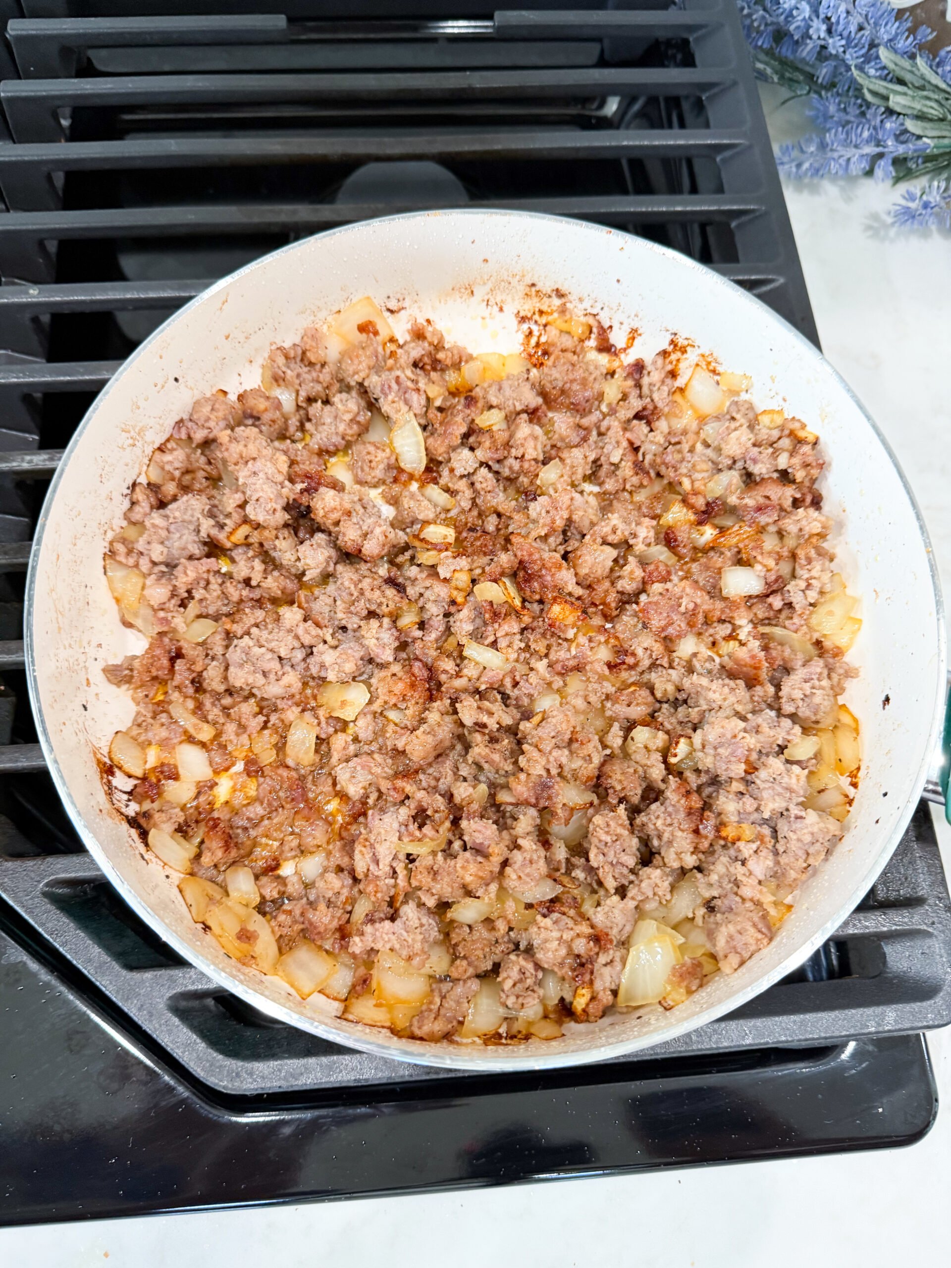 - Add sausage, onion and garlic to skillet; cook until sausage is browned and fully cooked.